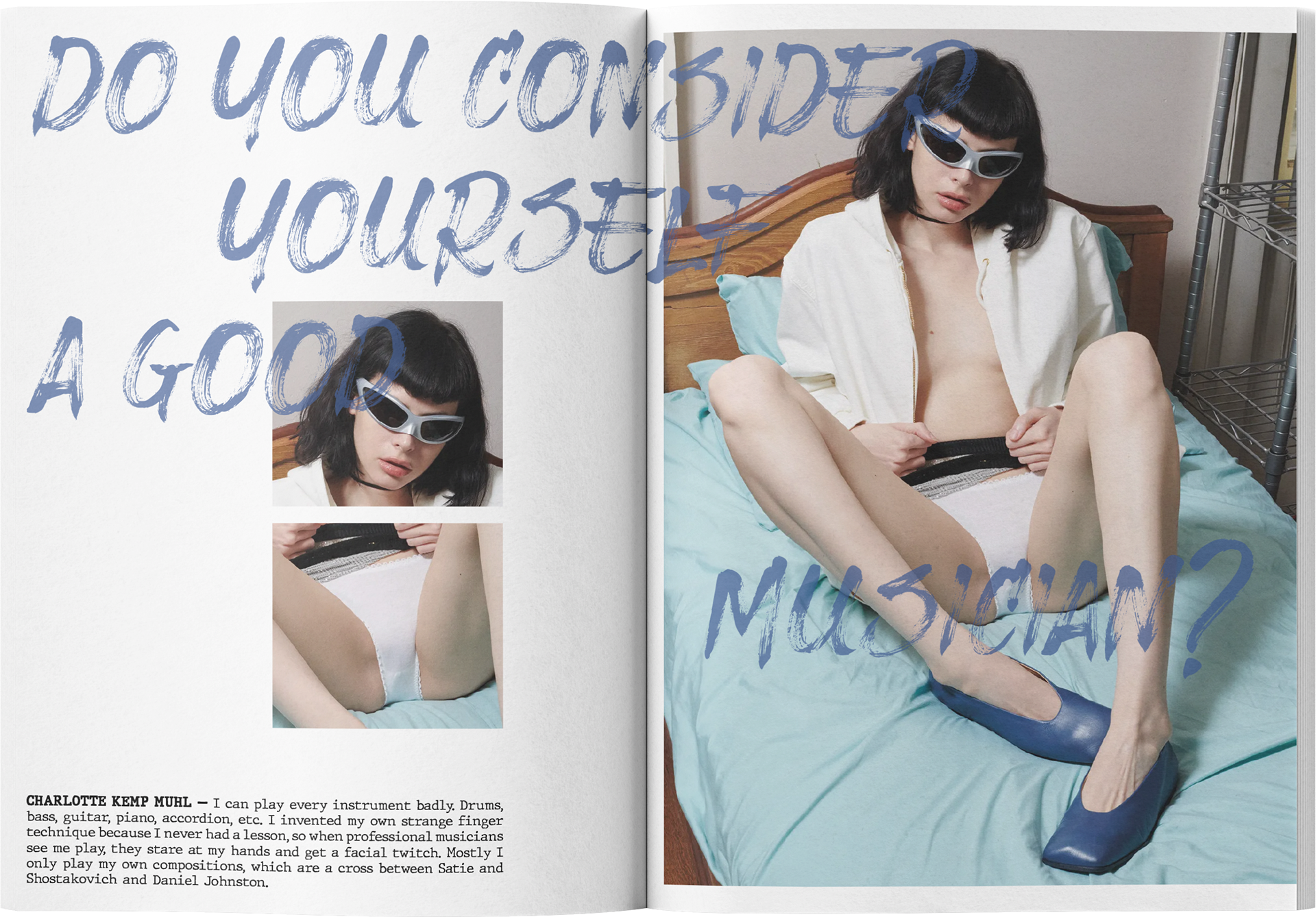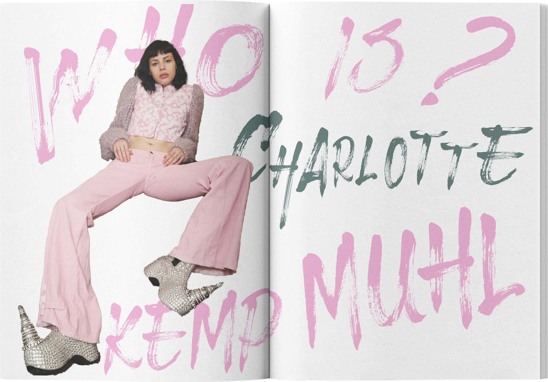 An editorial project built around an interview with Charlotte Kemp Muhl. The design highlights her charisma and self-awareness through a strong visual dialogue between image and text.